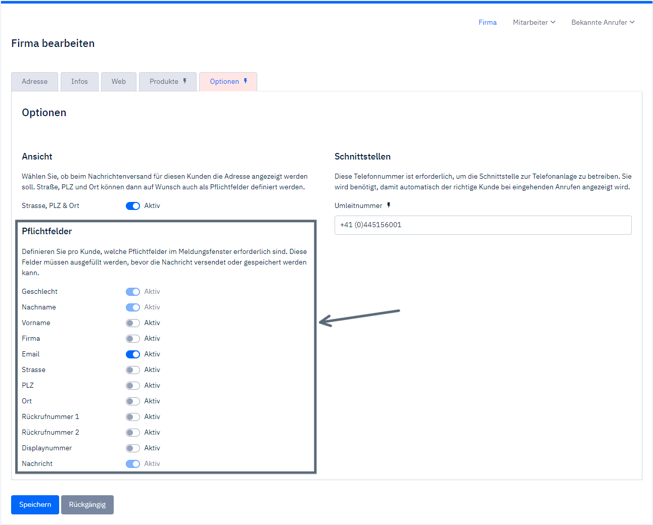Fixed error "Redirect number" In one of the recent updates, we added the redirect number in the new, red-marked 'Options' tab, which contains all functional information. An error when creating new companies, where a field was placed twice, has been fixed.