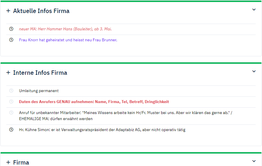 Save status "Accordion" The modules "Current Info", "Internal Info", "Recent Calls" and "Known Callers" now save the status of whether the accordion was open or closed in the employee's view. This status is adopted when opening a client next time.