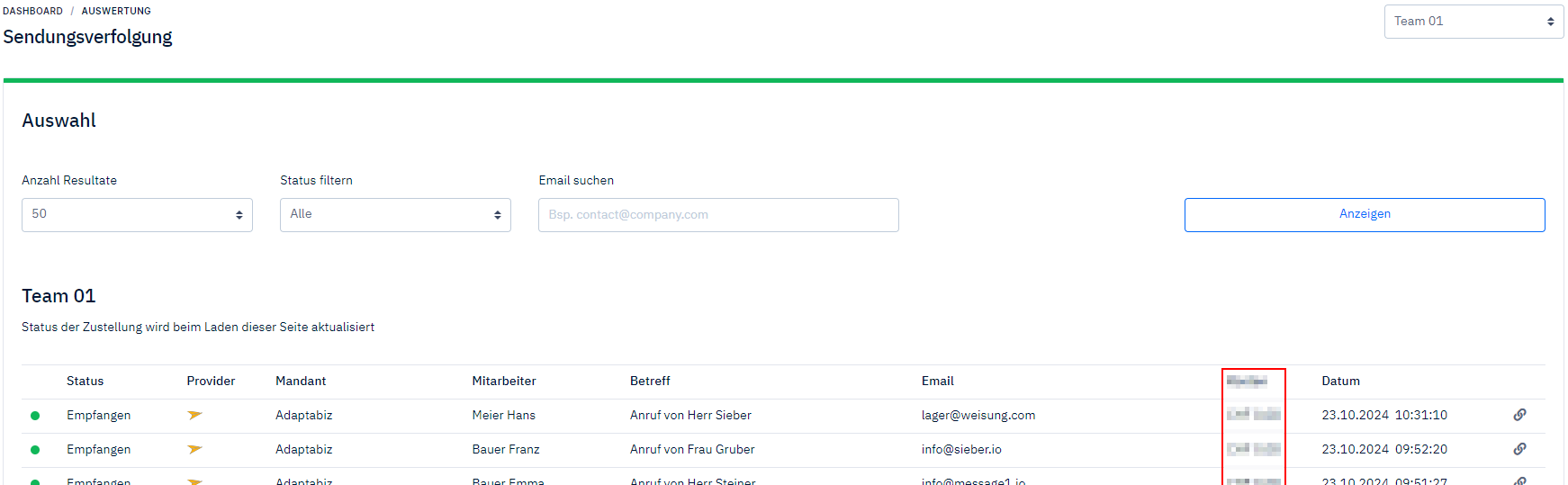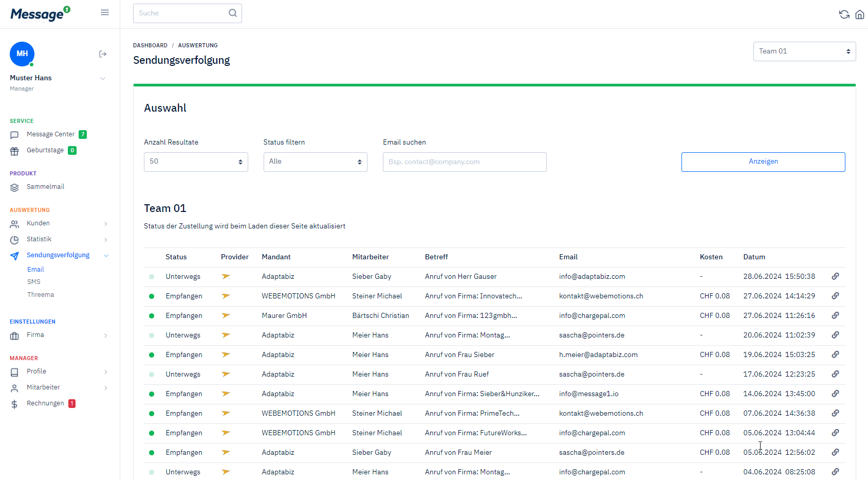 Redesign "Delivery tracking" We have redesigned the delivery tracking. Now you can also see which client and which employee of the client the email comes from. For SMS, there is also a text preview. Additionally, we have inserted a new link through which you can go directly to the sent message.