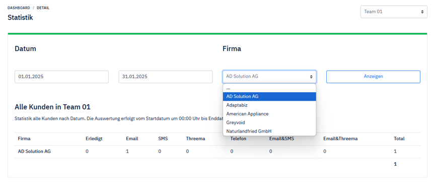 New filter in statistics under "Detail" At customer request, we have built a new filter in the statistics under "Detail". It is now possible to specifically select a company so that only the data of the selected company is displayed.